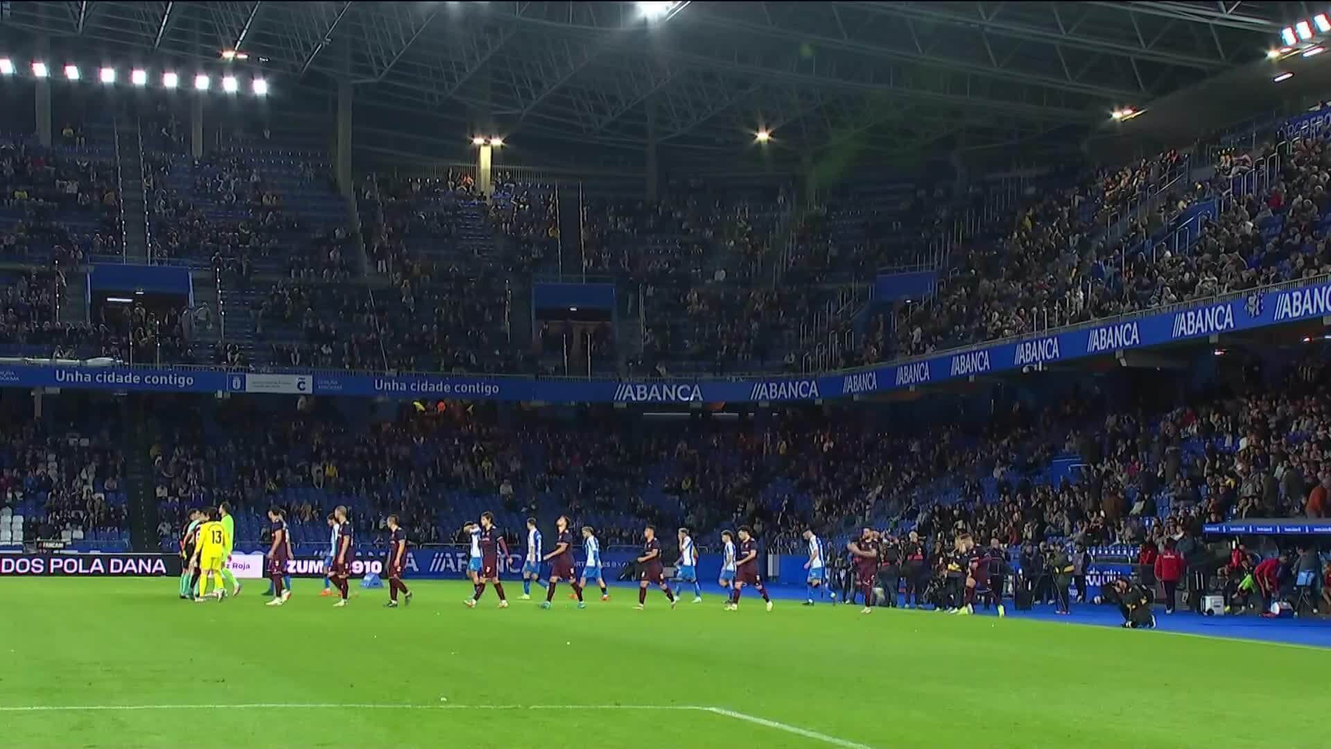 Min. 45+1: descanso en Riazor. El Dépor, que apretó más durante los primeros 25 minutos, vio cómo el Éibar se iba encontrando mejor situado en el terreno de juego, aunque el marcador todavía no se ha movido.