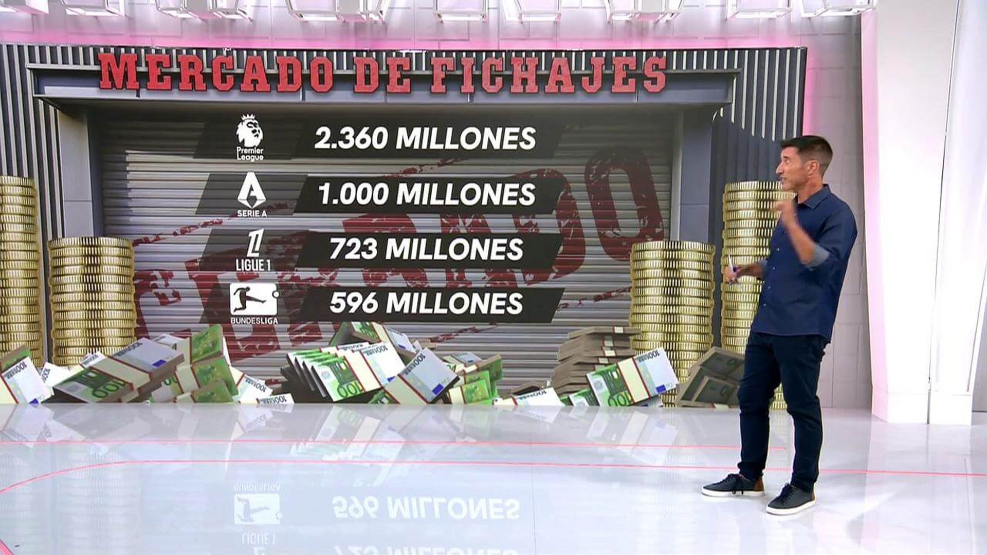 Así se ha mostrado en ElDesmarque de Cuatro donde se ha mostrado la cantidad de millones de euros, 2.360, en la Premier League con respecto al resto de competiciones. Una cifra muy alta que le situa en la pole de forma muy reseñable. De hecho, la segunda posición la ocupa la Serie A italiana que ha realizado en total una inversión de 1.000 millones de euros. Más de la mitad se ha movido en la competicióntransalpina con respecto a la británica. Su traspaso más caro ha sido el de Teun Koopmeiners hacia la Juventus de Turín por 54,7 millones de euros. Artem Dovbyk decidió abandonar España para firmar por la Roma a cambio de 30 millones de euros. Con respecto a la competición inglesa, los movimientos de mayor inversión han sido Dominic Solanke por 64,3 millones de euros a los spurs y Lenny Yoro, al Manchester United, por 62 milones. También hay una diferencia reseñable entre las tres siguientes competiciones. Y es que la Ligue 1, que ha perdido un gran activo como es Kylian Mbappé, se mantiene en el podium de equipos con movimientos. El movimiento más caro ha sido el de Joao Neves por el PSG a cambi de casi 60 millones de euros.