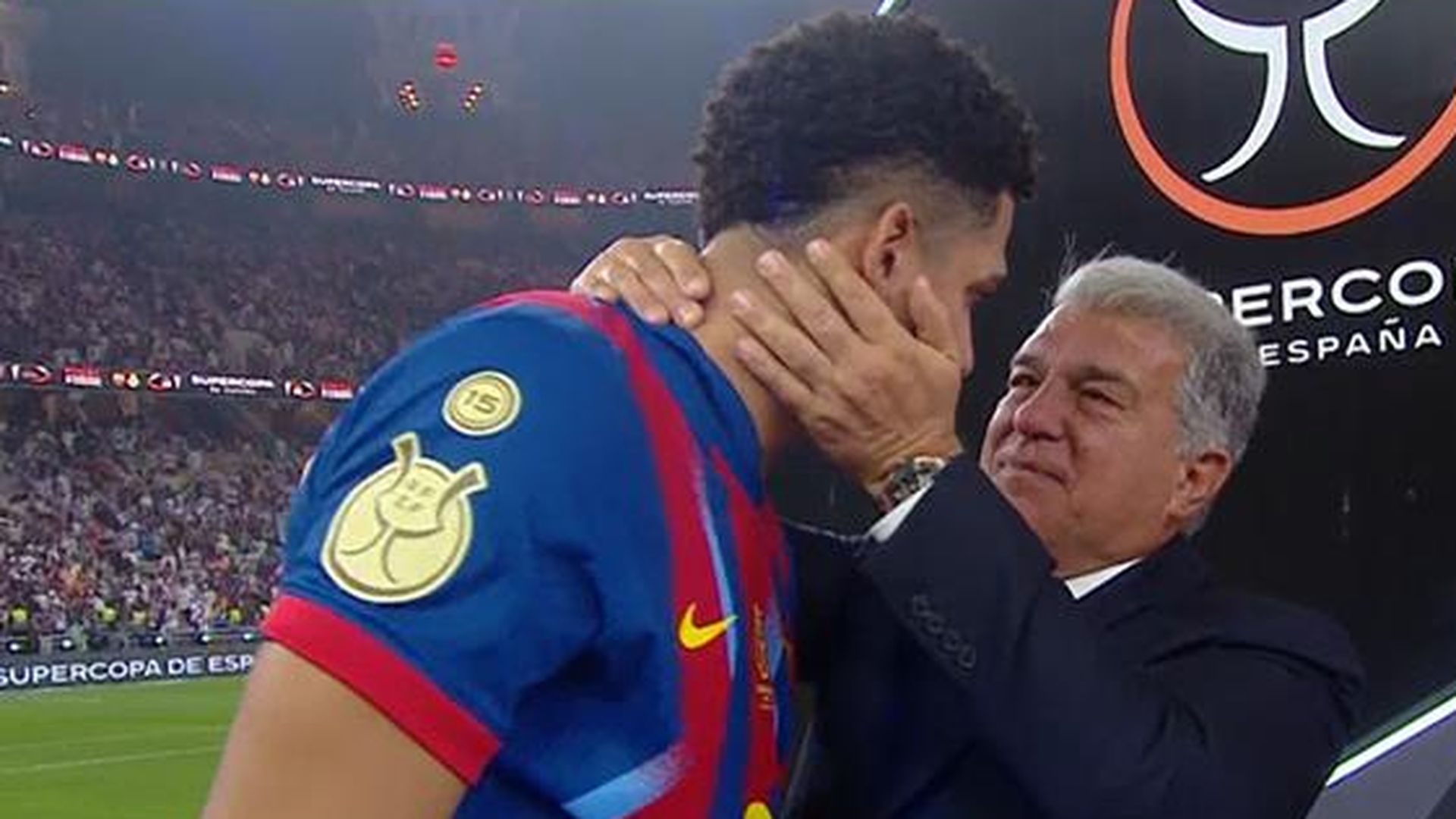 Con el título ya cosechado y la presión fuera de los jugadores, la celebración del título dejó un emotivo momento entre Ronald Araujo y Joan Laporta. El uruguayo, como segundo capitán del FC Barcelona, fue el último en la recogida de medallas y el elegido por sus compañeros para ser la persona encargada de levantar el trofeo.