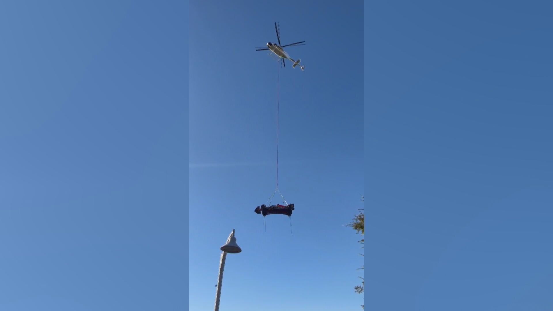 Llegar al Gran Premio de Las Américas siempre es sinónimo de puro espectáculo. La Fórmula 1 tiene el concepto de 'show' muy interiorizado, por lo que las escuderías del Mundial se adaptan a las diferentes situaciones. Uno de los que mejor lo han hecho es Red Bull. La marca austriaca ha llegado al trazado estadounidense de la manera más irreal posible, incluso aplicando a las mil maravillas su eslogan de marca de 'Red Bull te da alas'. Por los aires, así han llegado los monoplazas de la fábrica austriaca al Circuito de Austin. Una imagen que ha impactado a todo el mundo y ya está dando la vuelta al mundo en redes sociales. Y es que el hecho de llegar volando enganchado a un helicóptero impacta tanto a los aficionados de la Fórmula 1 como los que no lo son.