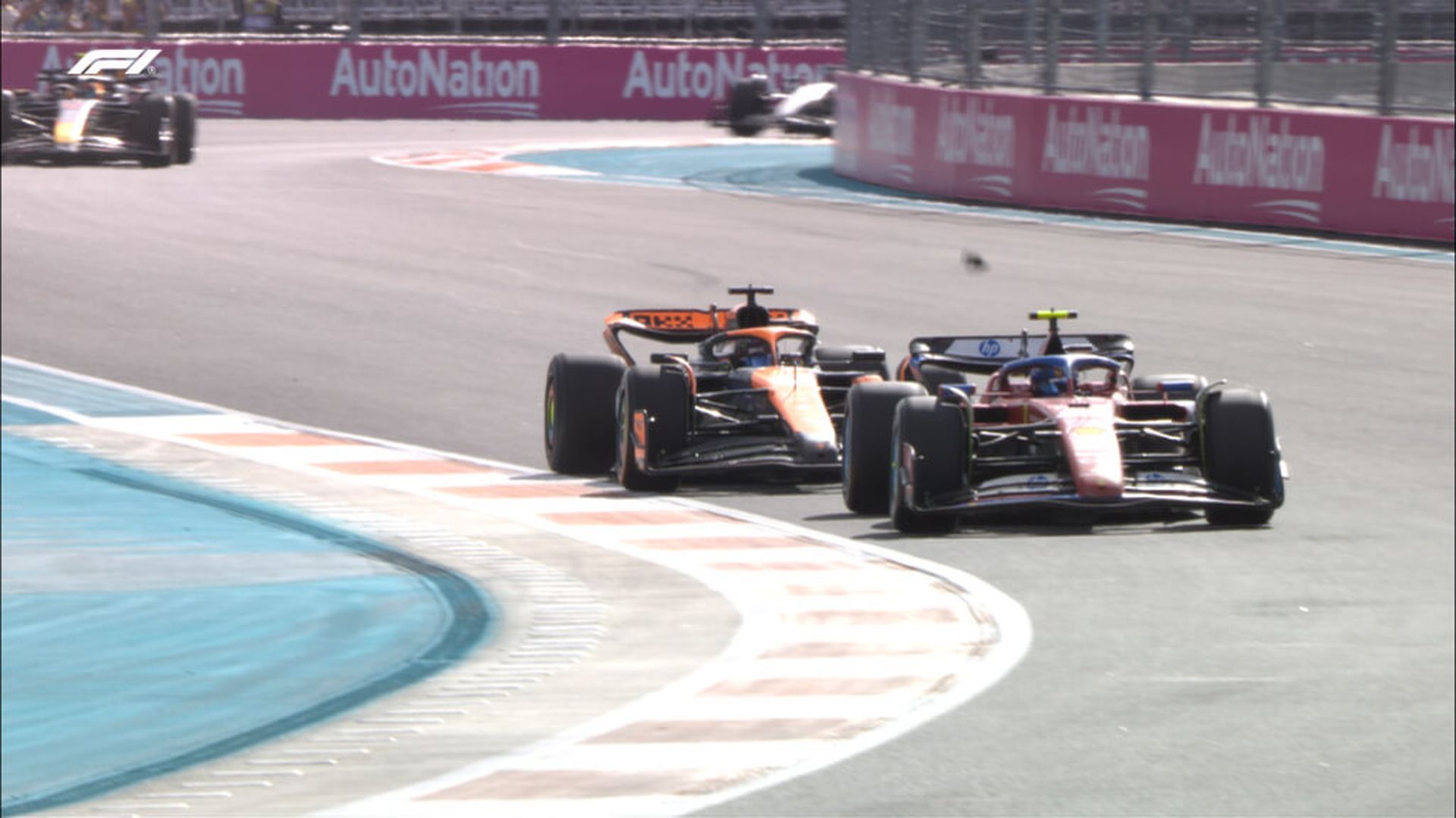 Carlos Sainz se está ganado el suelo en la carrera del Gran Premio de Miami. El piloto de Ferrari ha tenido sus más y sus menos con Checo Pérez primero y, luego, con Oscar Piastri. En la salida, Sainz estuvo cerca de abandonar tras una maniobra muy al límite de Pérez; llegando al final de la carrera, el de Ferrari libró una intensa batalla con el McLaren de Piastri. Esa segunda lucha terminó con Sainz por delante, pero durante la misma el madrileño se quejó en más de una ocasión por radio de los movimientos del austrialiano. Tras la salida, es casi un milagro que pilotos como Sainz o Charles Leclerc sigan en la carrera. Pérez intentó algo muy complicado. Tiró de frenos para avanzar posiciones, pero rozó incluso a su compañero de equipo. El piloto mexicano estuvo muy cerca de terminar con la carrera de Sainz, pero el español fue capaz de ver por el retrovisor el optimismo del de Red Bull. Inmediatamente, Sainz habló a su equipo para alzar la voz y reclamar una sanción por la agresividad innecesaria de Checo. "¿Qué coño ha sido eso? ¡Deberían penalizarlo! ¡Casi nos deja fuera!", dijo el español por radio.