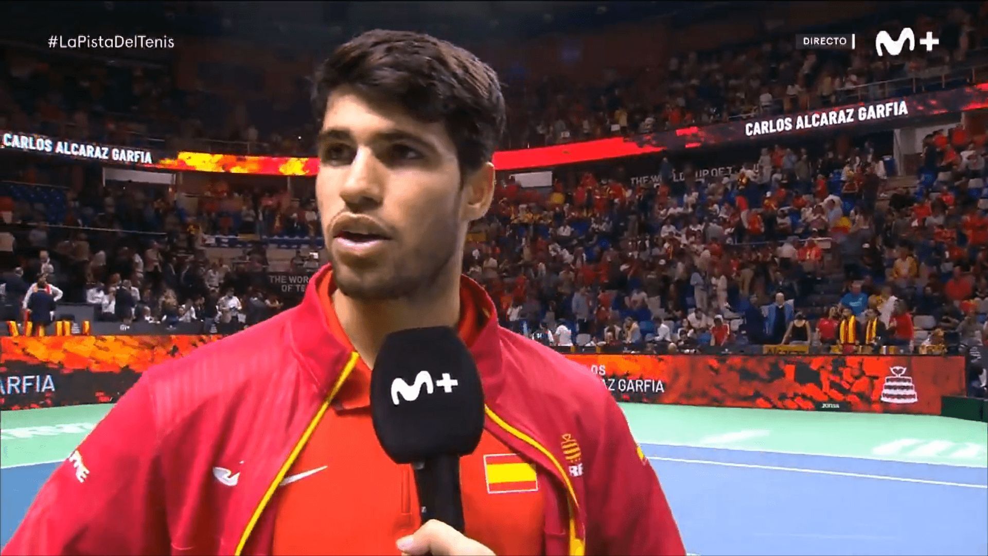 Carlos Alcaraz ha tirado de una nueva exhibición para igualar la eliminatoria de España ante Holanda tras la derrota de Rafa Nadal. El tenista murciano ha tirado de garra para sacar adelante su partido ante Griekspoor por 6-7 y 3-6 con un Martín Carpena entregado. Todos los presentes, compañeros incluidos, han disfrutado y celebrado cada punto ante el holandés. Es una eliminatoria especial, por la despedida de Rafa Nadal del mundo del tenis, y todos son conscientes de ellos. Y por eso, Carlos Alcaraz, que ahora tendrá que disputar el partido de dobles contra Granollers, se lo ha dedicado a Rafa Nadal. "Vamos a ir a tope. De momento es lo que está previsto. Voy a transmitirle al capitán, a David, que yo estoy 'ready' por si me necesita. Si saltamos Marcel y yo vamos a darlo todo por España y por Rafa", aseguró el murciano ante los micrófonos de Movistar.