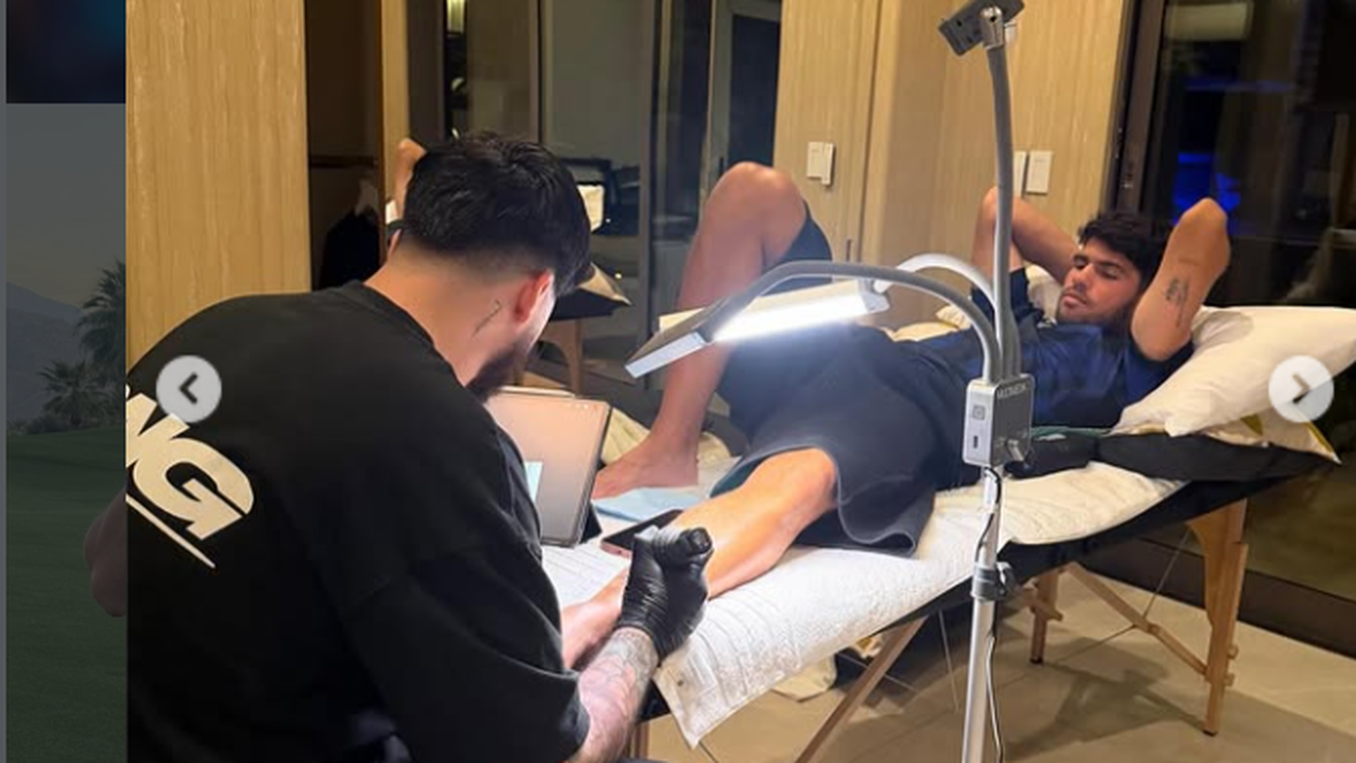 Esa localización hace que el dibujo apenas sea visible durante sus partidos al ser tapado por el calcetín, pero al jugador, en un post colgado en su cuenta de Instagram, se le ve en una camilla mientras Joaquín Ganga, amigo personal, también vecino de El Palmar y que es su tatuador personal, realiza su trabajo sobre su piel. Este artista del 'tattoo' tiene estudio en Los Ángeles, además de en su localidad natal, y le hizo hueco en su cargada agenda a Carlos aprovechando que estaba en la zona.