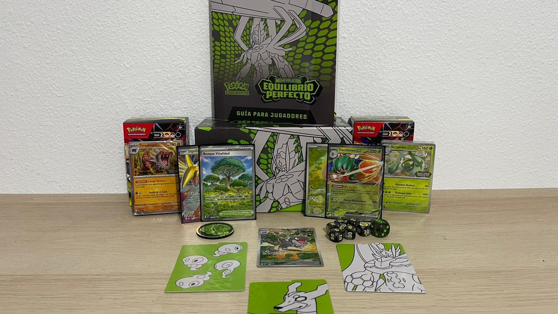 Con el mismo referente de Zygarde y ese reconocido color verde de las pequeñas criaturas que colorean al pokémon legendario, es fácil volcar la caja en la estantería para darle un toque reconocible. Y desde ahí, a todos los detalles de la ETB porque desde la guía de jugadores a las fundas o el dado principal, todo lo baña ese tono que sin duda deja una de las mejores monedas de la última época con esa pequeña serpiente celular que da forma a las versiones mayores de Zygarde. Ese primer impacto es total, pero en el gameplay tiene su ampliación.